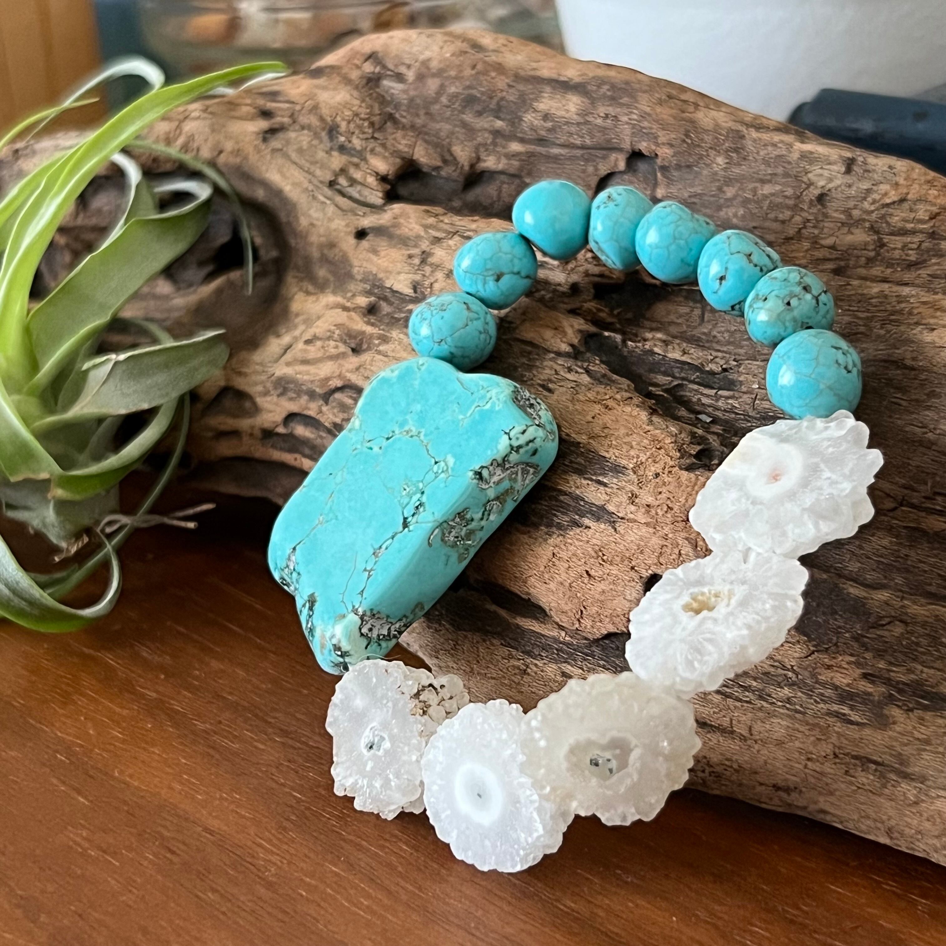 ダイナミックでパワー溢れる大粒のマグネサイトターコイズに、ミルキーで優しい波動のソーラークォーツ(スタラクタイト)と人と人との絆や友情を深めてくれるターコイズの組み合わせ。