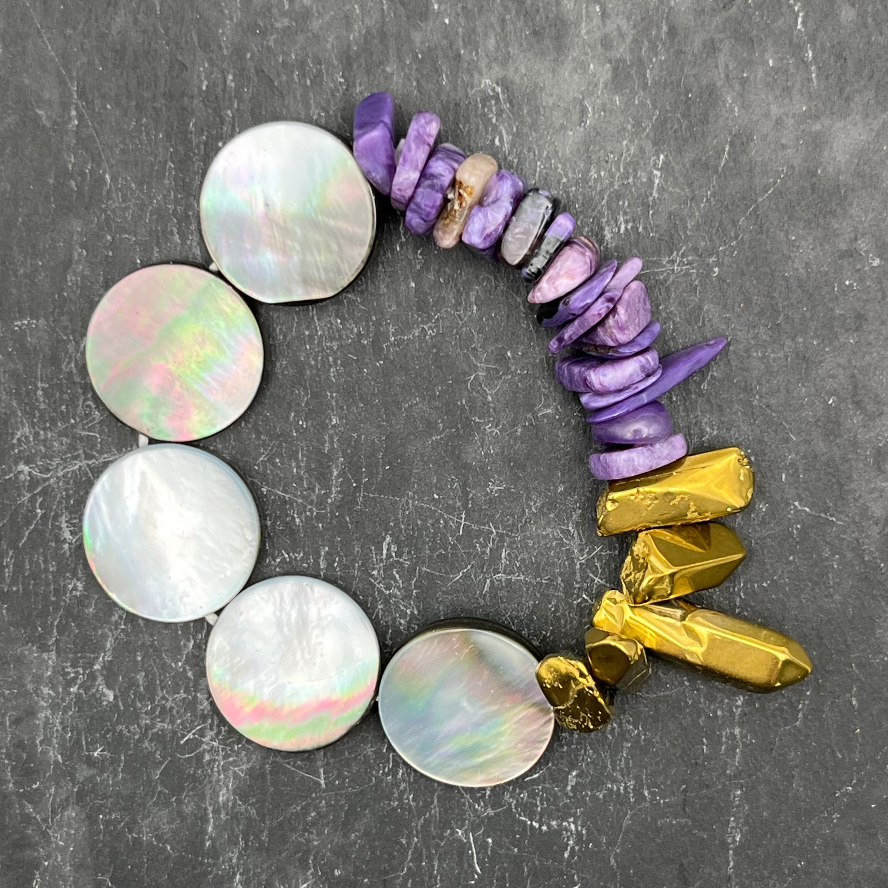 癒しの力が強く浄化作用も非常に強いチャロアイトと、インパクトのあるゴールド氷柱、そして持続力や忍耐力を高めて精神的な強さをサポートするブラックシェルのブレスレットです。 また霊的マイナスエネルギーから身を守り、不調の状態からの回復をサポートします。 危険回避/癒し/人間関係の回復/自立心/浄化