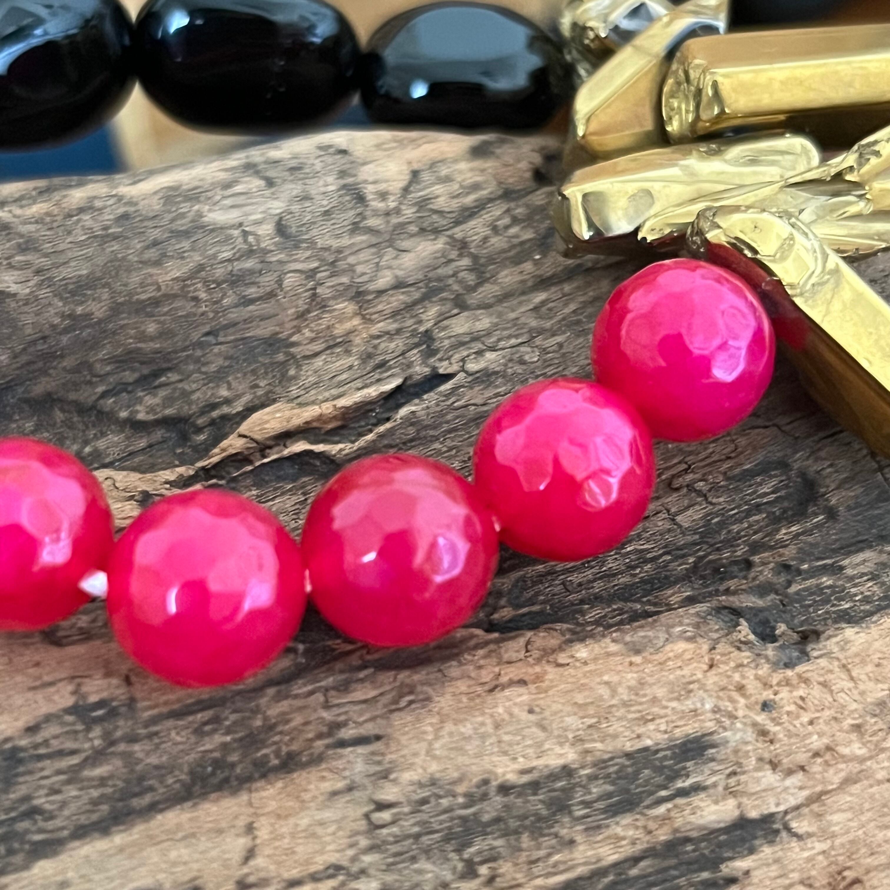 強烈な存在感のゴールドの氷柱、邪念を払い意志の力を高めて周囲に流されない精神的な強さをもたらしてくれるオニキス、そしてインパクト大で仕事や夢、恋愛の達成に大きな効果をもたらすと伝われピンクジェイドを組み合わせたパワー溢れるブレスレットです。 潜在能力引き出し/邪気祓い/目標達成/迷いなき信念